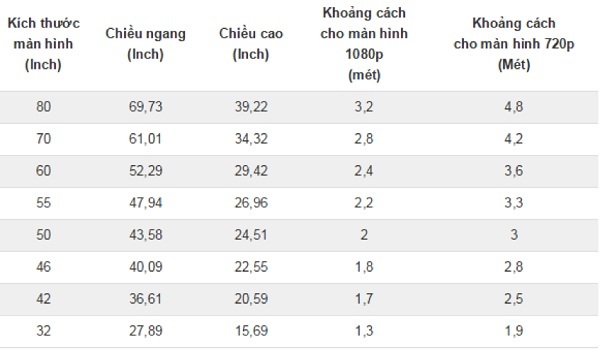 Khoảng cách tối thiểu = kích thước màn hình (số inch) x 2,54 x 2